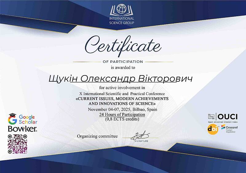 Викладачі кафедри БДМ доцент Щукін О.В. і доцент Орел О.В. прийняли участь у двох конференціях у країнах ЄС: X Міжнародна науково-практична конференція «Current issues, modern achievements and innovations of science» і XI Міжнародна науково-практична конференція «World science: problems, issues and prospects for development». Перша конференція проходила з 04 по 07 листопада 2025 р. у місті Більбао, Іспанія і друга – з 11 по14 листопада 2025 р. у місті Софія, Болгарія.