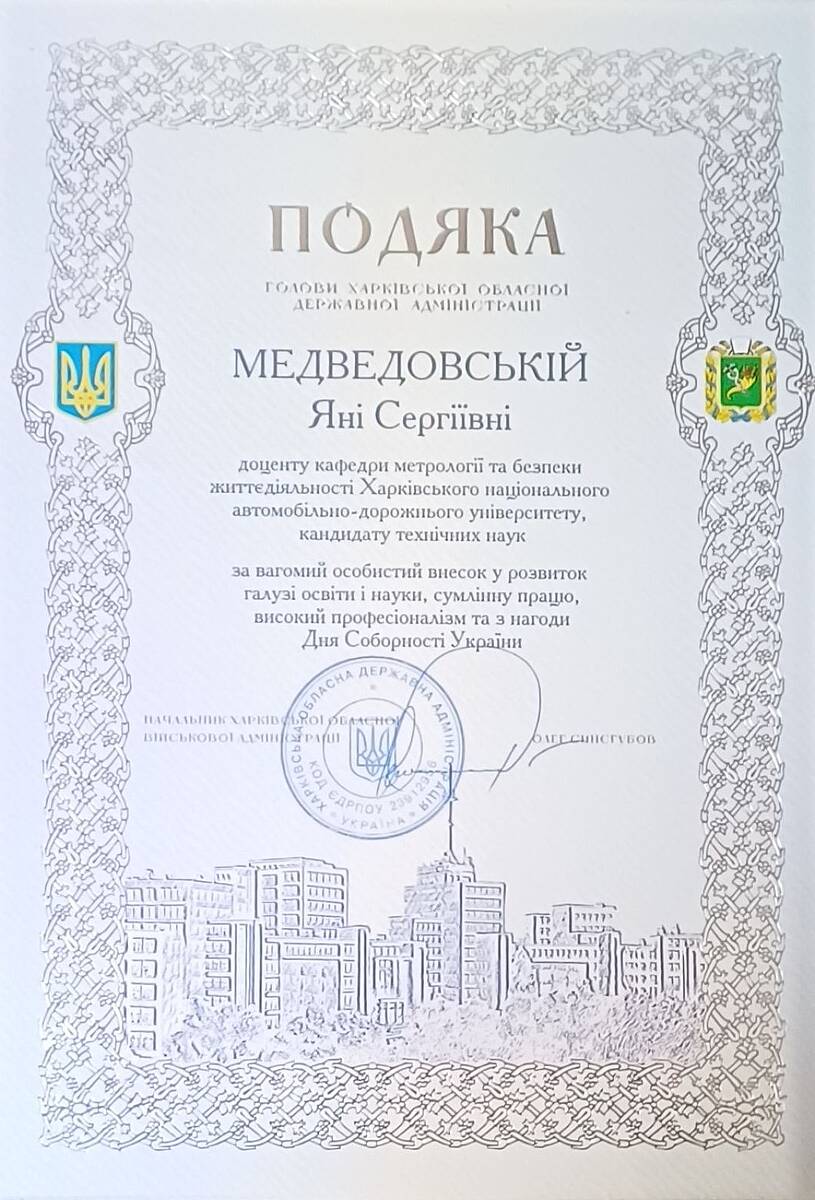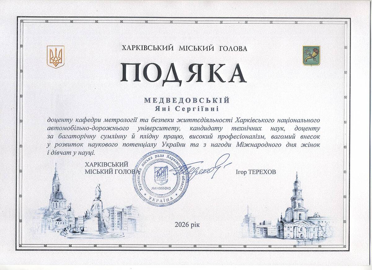 2018 — диплом ІІ ступеня конкурсу «Молодий новатор Харківщини» за комплексну розробку «Спосіб визначення вхідної дії нелінійного інерційного вимірювального каналу»;