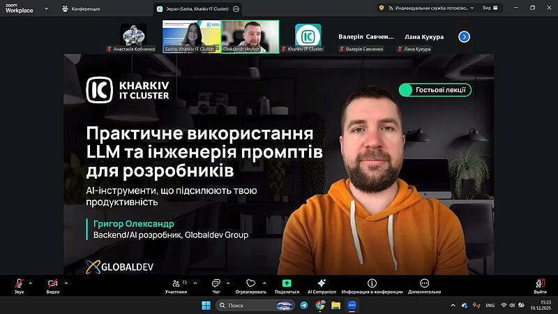 19 грудня студенти кафедри комп'ютерних наукі інформаційних систем відвідали онлайн-лекцію, організовану Kharkiv IT Cluster спільно з Globaldev Group. Захід був присвячений практичному застосуванню великих мовних моделей та інженерії промптів у розробці програмного забезпечення.