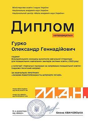 Нагороду присуджено у категорії «Навчальні програми за напрямами позашкільної освіти» (науково-технічний напрям) за навчальну програму «Основи робототехніки та Інтернету речей».
