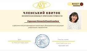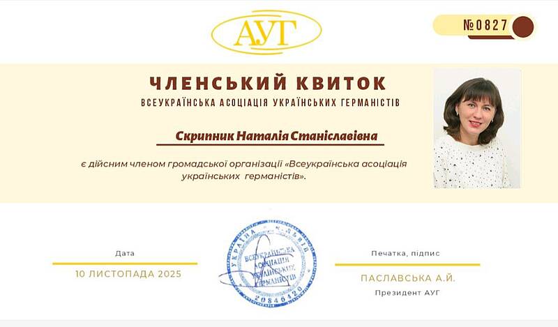 Вітаємо доцента кафедри іноземних мов Наталію Станіславівну Скрипник з прийомом у асоційовані члени громадської організації "Всеукраїнська асоціація українських германістів". Бажаємо подальших успіхів у професійному розвитку у царині німецької мови та німецькомовних країн!