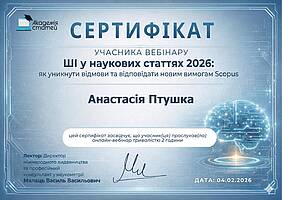 Завідувачка кафедри Птушка Анастасія Сергіївна успішно отримала сертифікат про проходження навчання «ШІ у наукових статтях 2026: як уникнути відмови та відповідати новим вимогам SCOPUS».