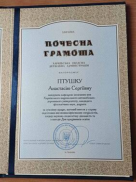 Завідувача кафедри іноземних мов Харківського національного автомобільно-дорожнього університету, кандидата філологічних наук, доцента Птушку Анастасію Сергіївну відзначели Почесною грамотою Харківської обласної державної адміністрації за сумлінну працю, вагомий внесок у справу підготовки висококваліфікованих спеціалістів та плідну науково‑педагогічну діяльність.