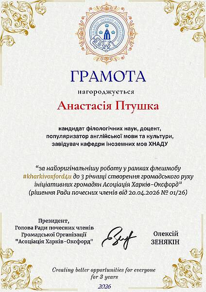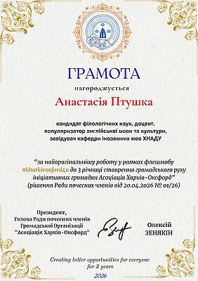 Завідувачку кафедри іноземних мов, кандидатку філологічних наук, доцентку та популяризаторку англійської мови і культури Анастасію Сергіївну Птушку нагороджено почесною грамотою за вагомий внесок у розвиток освітніх та культурних ініціатив.