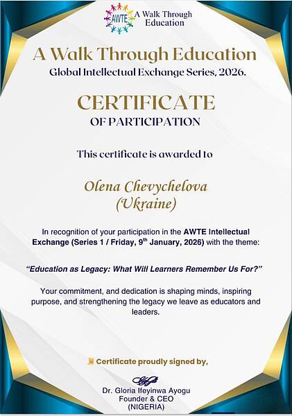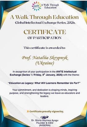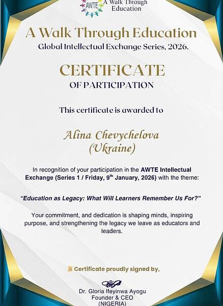 Викладачі кафедри іноземних мов ХНАДУ, доцент Наталія Скрипник, старший викладач Олена Чевичелова та студентка групи МЛ-41-22 за спеціальністю 035.10 Філологія "Прикладна лінгвістика" Аліна Чевичелова долучилися до заходу глобального інтелектуального обміну викладачів англійської мови "Освіта як спадщина: як нас запам'ятають учні", що відбувся 9 січня 2026 року.