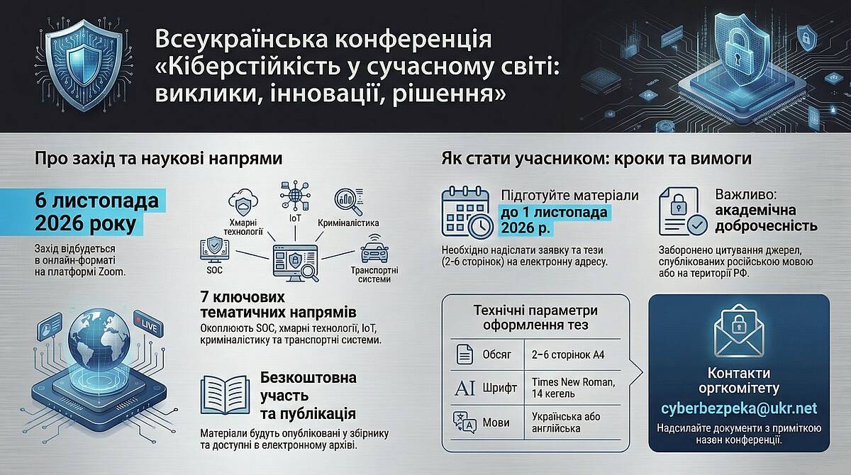Для включення в програму конференції просимо надіслати заявки на участь та матеріали тез доповіді до Оргкомітету до 01.11.2026 в електронному вигляді за адресою cyberbezpeka@ukr.net з приміткою: Всеукраїнська науково-практична інтернет конференція здобувачів вищої освіти і молодих учених «Кіберстійкість у сучасному світі: виклики, інновації, рішення.