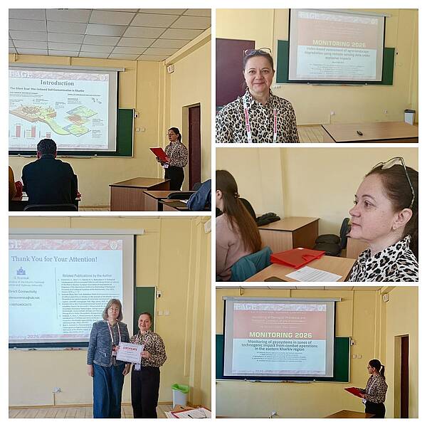 She opened the afternoon session with a keynote presentation titled: "Monitoring of geosystems in zones of technogenic impact from combat operations in the eastern Kharkiv region." The study, co-authored with colleagues Y. Buts, V. Barbashyn, O. Nikitchenko, and M. Krainiuk, focuses on the critical issue of monitoring geosystems within areas affected by military operations in eastern Ukraine.