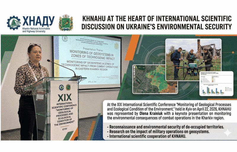 On April 22, 2026, Kyiv hosted the XIX International Scientific Conference "Monitoring of Geological Processes and Ecological Condition of the Environment." This prestigious forum gathered leading experts to address the most pressing environmental and technological challenges of the modern era. Kharkiv National Automobile and Highway University was represented at the event by Olena Krainiuk, Head of the Cybersecurity Department.
