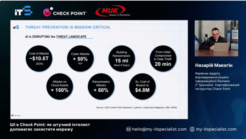 Викладачі кафедри кібербезпеки долучилися до вебінару «ШІ в Check Point: як штучний інтелект допомагає захистити мережу», організованого компанією IT Specialist. Спікером заходу виступив Назарій Макогін, керівник відділу впровадження рішень інформаційної безпеки та сертифікований інструктор Check Point.