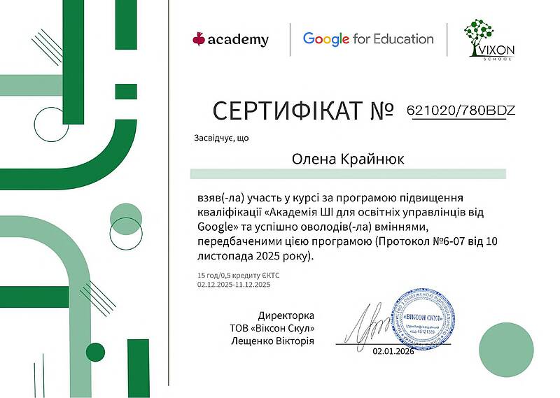 Світ стрімко змінюється, і ХНАДУ рухається в ногу з часом. Завідувачка кафедри кібербезпеки Олена Крайнюк отримала сертифікат про успішне завершення курсу «Академія ШІ для освітніх управлінців від Google». Це навчання стало важливим кроком у цифровій трансформації нашого закладу. Програма охоплювала практичні кейси використання генеративного штучного інтелекту для вирішення реальних управлінських завдань. Застосування таких інструментів, як NotebookLM та Gemini, дозволяє значно пришвидшити роботу з аналітикою, автоматизувати рутинні процеси звітності та створювати якісні візуальні матеріали. Впровадження цих технологій допоможе нам вивільнити час для головного — розвитку якісної освіти та науки.