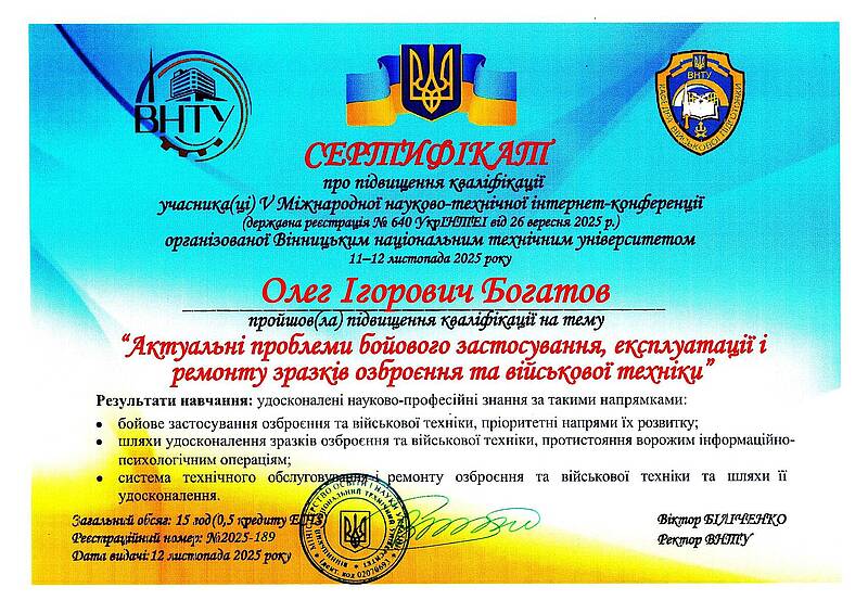 Викладачі кафедри метрології та БЖД отримали Сертифікати про підвищення кваліфікації учасника V Міжнародної науково-технічної інтернет-конференції (державна реєстрація № 640 УкрІНТЕІ від 26 вересня 2025 р.) організованої Вінницьким національним технічним університетом 11 - 12 листопада 2025 року.