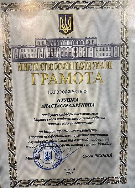 Завідувач кафедри іноземних мов Харківського національного автомобільно-дорожнього університету Птушка Анастасія Сергіївна отримала Грамоту від Міністерства освіти і науки України за ініціативу та наполегливість, високий професіоналізм, сумлінне виконання службових обовʼязків та вагомий особистий внесок у розвиток сфери освіти і науки України.