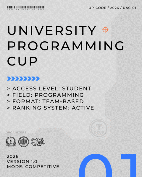 University Programming Cup 2026 — це серія офлайн змагань за різними напрямками computer science в командах з трьох людей і фіналом у форматі олімпіади з програмування за правилами ICPC.