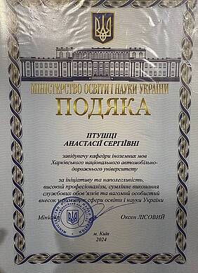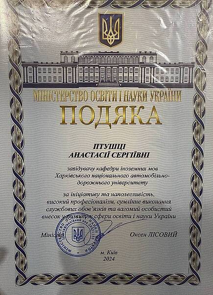 Завідувачка кафедрою іноземних мов Харківського національного автомобільно-дорожнього університету Птушка Анастасія Сергіївна отримала Подяку від Міністерства освіти і науки України за ініціативу та наполегливість, високий професіоналізм та сумлінне виконання службових обов'язків та вагомий особистий внесок у розвиток сфери освіти і науки України.