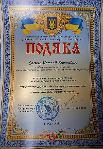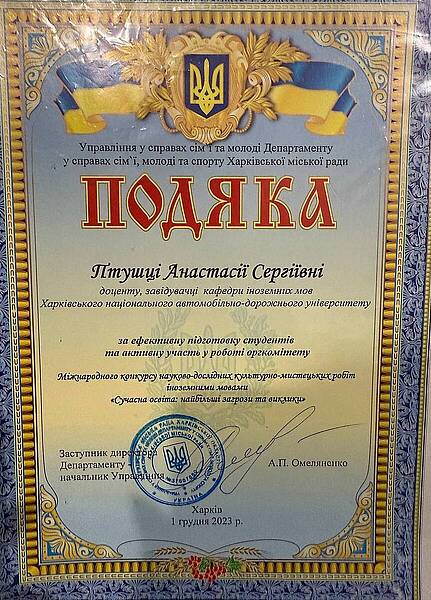 Завідувачка кафедрою іноземних мов Харківського національного автомобільно-дорожнього університету, доц. Птушка Анастасія Сергіївна та проф. Саєнко Наталія Віталіївна отримали Подяку від Управління у справах сім'ї та молоді Департаменту у справах сім'ї, молоді та спорту Харківської міської ради за ефективну підготовку студентів та активну участь у роботі оргкомітету Міжнародного конкурсу науково-дослідних культурно-мистецьких робіт іноземними мовами «Сучасна освіта: найбільші загрози та виклики»