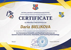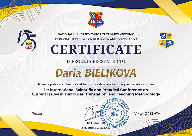 Кафедра іноземних мов заохочує своїх студентів до участі у професійно-наукових заходах. Так, студентки Даря Бєлікова та Вікторія Моркова під керівництвом доцента Наталія Скрипник взяли участь у I Міжнародній науково-практичній конференції «Актуальні проблеми дискурсології, перекладознавства та методики викладання», що відбулася 21 листопада 2025 року у Національному університеті "Запорізька політехніка", м.Запоріжжя.