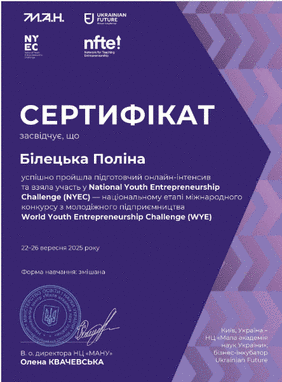 Студентка групи МА-11-25 Білецька Поліна успішно пройшла підготовчий онлайн-інтенсив та взяла участь у National Youth Entrepreneurship Challenge (NYEC) — національному етапі міжнародного конкурсу з молодіжного підприємництва World Youth Entrepreneurship Challenge (WYE)