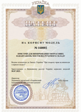 Вітаємо професора кафедри КНіІС ХНАДУ Левтерова А.М. з отриманням патенту на корисну модель №160002 «Пристрій для вимірювання тимчасових навантажень мостів від рухомого складу», зареєстрованого в Державному реєстрі України корисних моделей 30.07.2025 р.