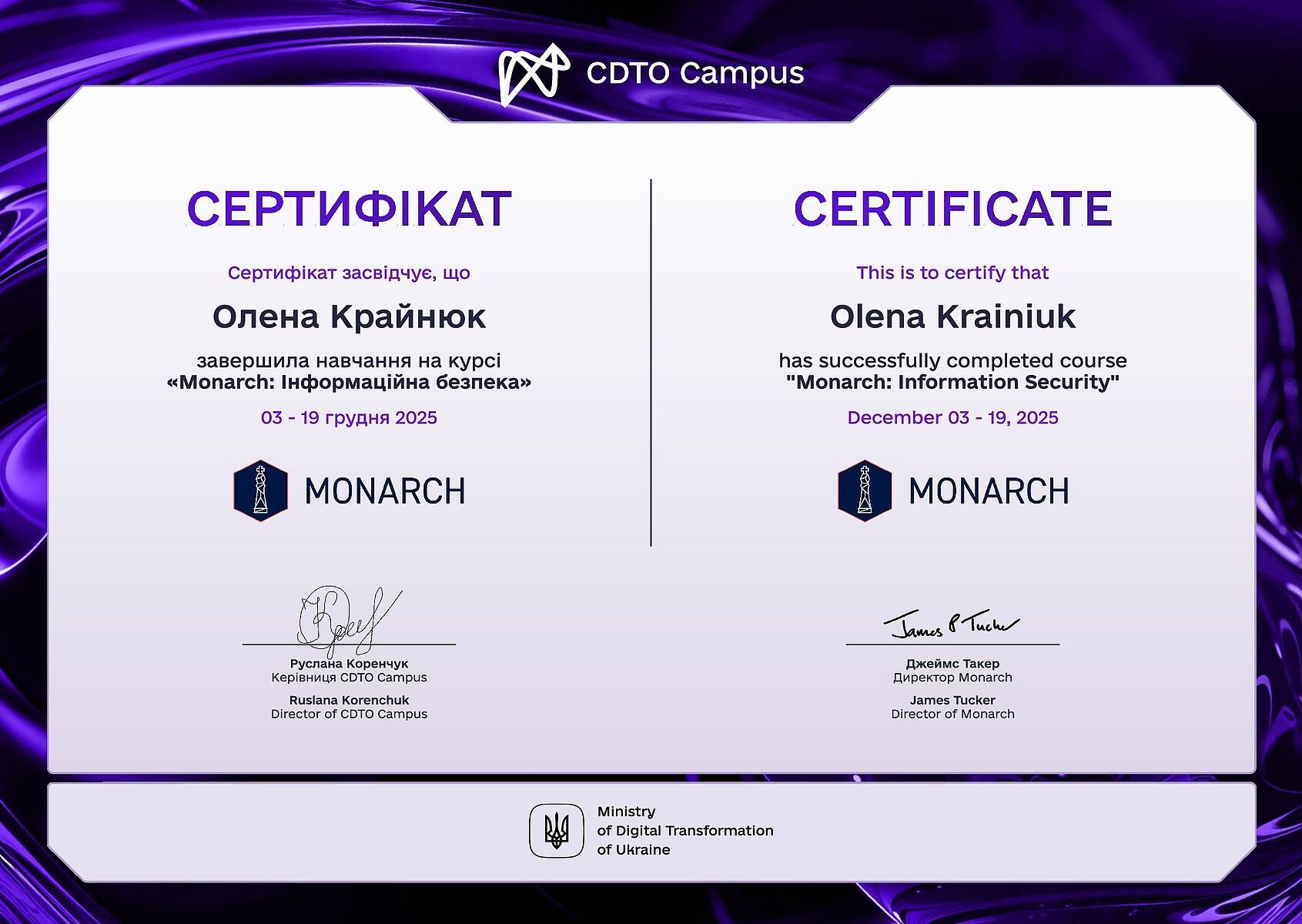 Завідувачка кафедри кібербезпеки Олена Крайнюк успішно завершила навчання за програмою «Monarch: Інформаційна безпека», організованою CDTO Campus (проєкт Міністерства цифрової трансформації України) у партнерстві з міжнародною ініціативою Monarch....