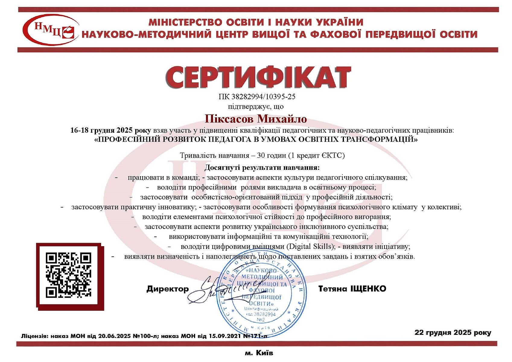 З 16 по 18 грудня 2025 року Михайло Піксасов успішно пройшов курс підвищення кваліфікації на тему «Професійний розвиток педагога в умовах освітніх трансформацій». Навчальна програма тривалістю 30 годин (1 кредит ЄКТС) була зосереджена на впровадженні...