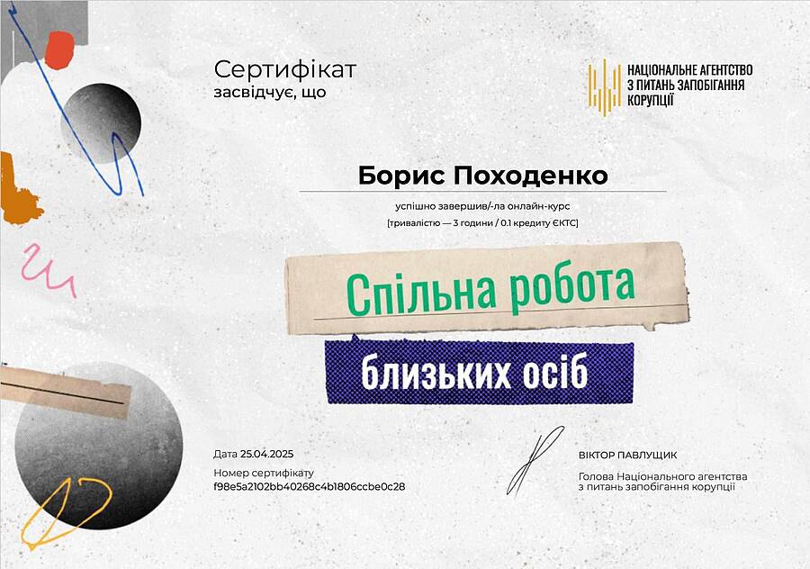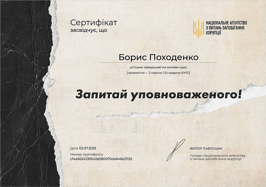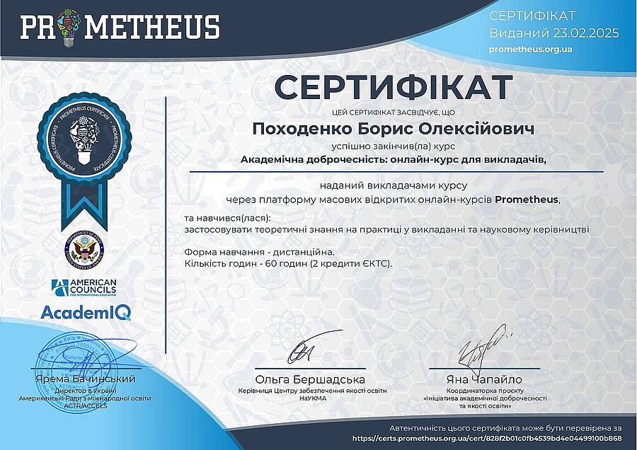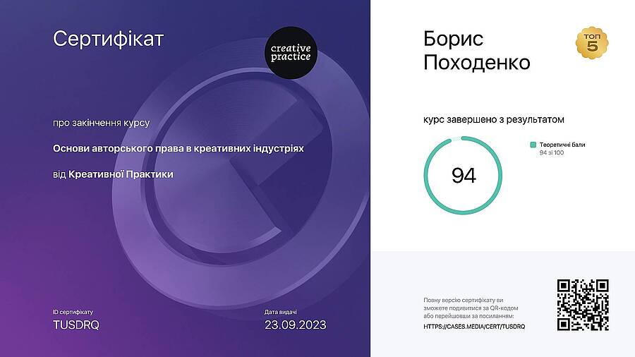 Старший викладач Борис Походенко успішно пройшов навчання за програмою «Основи авторського права в креативних індустріях». Із результатом 94 бали він увійшов до ТОП-5 випускників курсу. Дана сертифікація підтверджує високу кваліфікацію Бориса у питаннях правового регулювання та захисту творчих напрацювань у цифровому середовищі.
