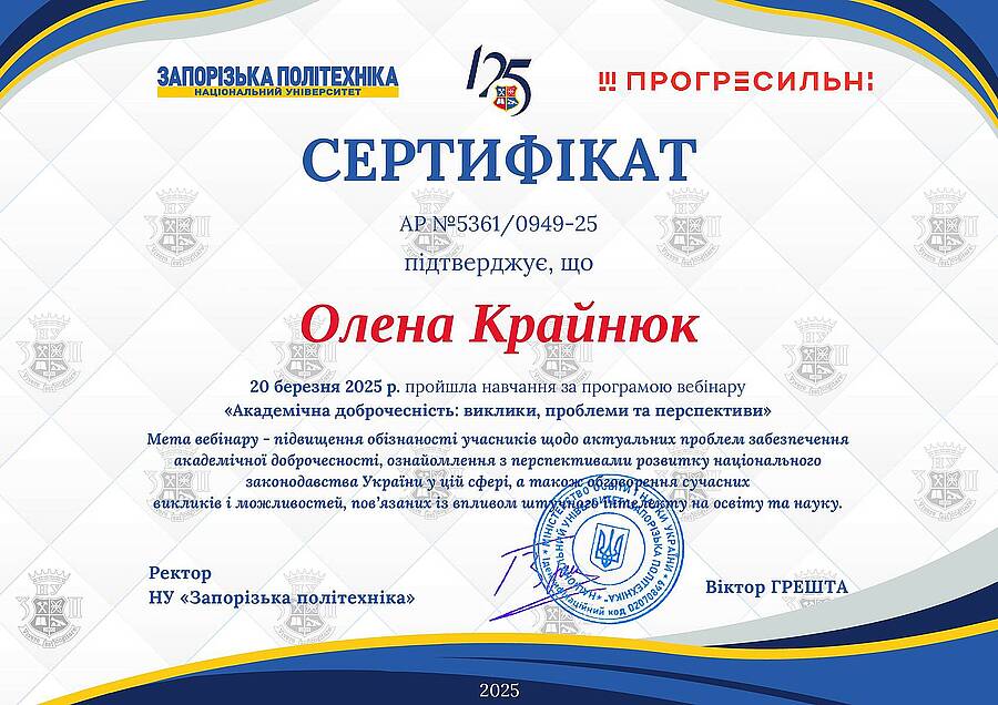 Завідувачка Олена Крайнюк отримала сертифікат за успішне проходження навчання 20 березня 2025 року. Програма вебінару охоплювала питання національного законодавства у сфері доброчесності та аналіз сучасних викликів для освіти та науки. Організатор — Національний університет «Запорізька політехніка».