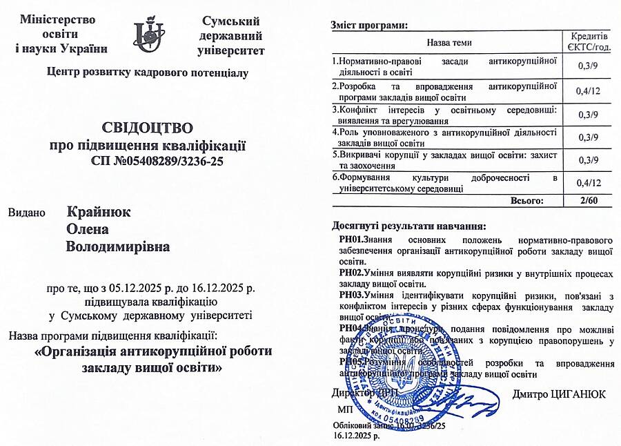 Завідувачка Олена Крайнюк отримала свідоцтво про підвищення кваліфікації (СП №05408289/3236-25). Протягом навчання у Сумському державному університеті вона опанувала програму з організації антикорупційної роботи в ЗВО обсягом 2 кредити ЄКТС. Отримані знання будуть застосовані для вдосконалення управлінських процесів та захисту академічної доброчесності.