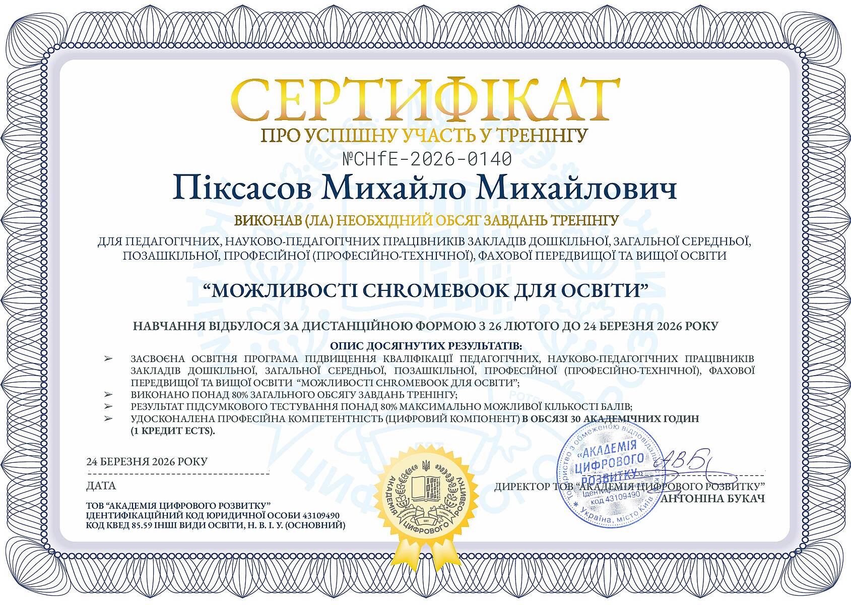 Доцент кафедри кібербезпеки Михайло Піксасов успішно пройшов спеціалізований навчальний курс від компанії Cloudfresh — «Можливості Chromebook для освіти».